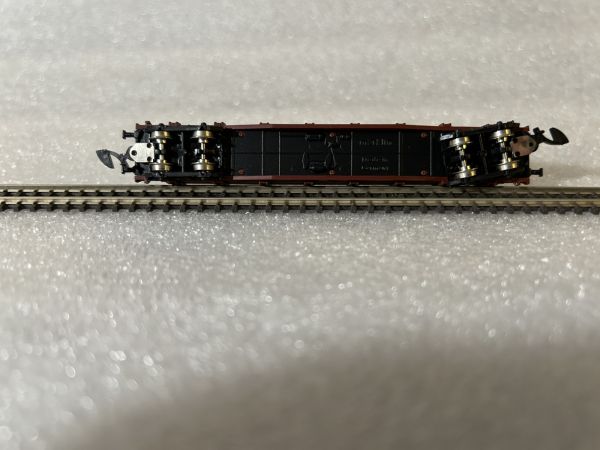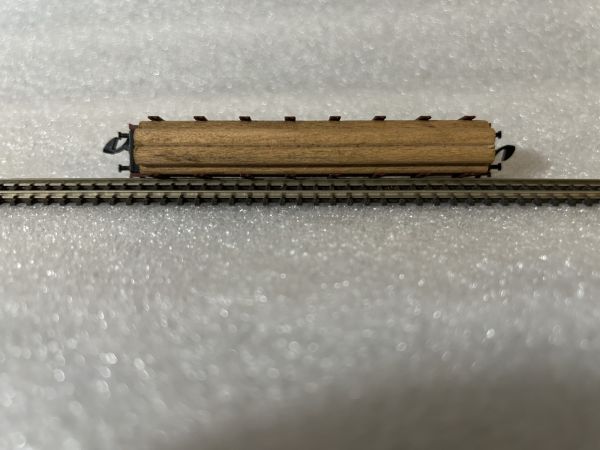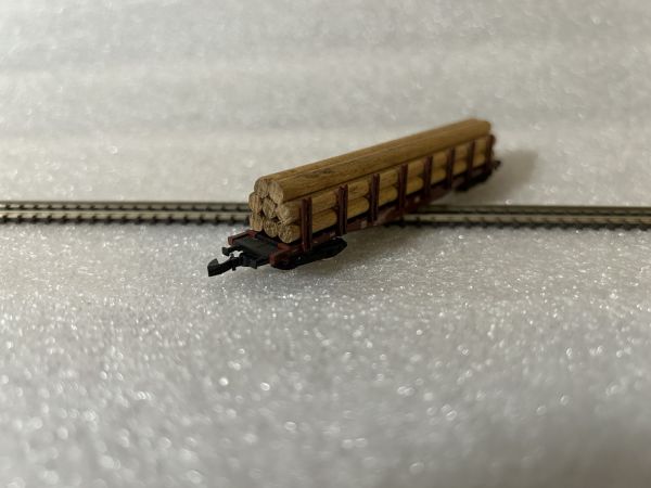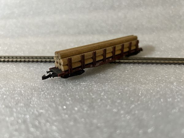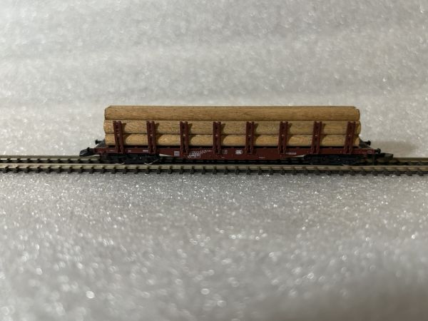 Beladung mit Stammholz. Mit den beiliegenden 8 schwarzen Gummiringen können die Spannbänder an den Rungen vorbildgerecht nachgebildet werden. Länge über Puffer 95 mm.