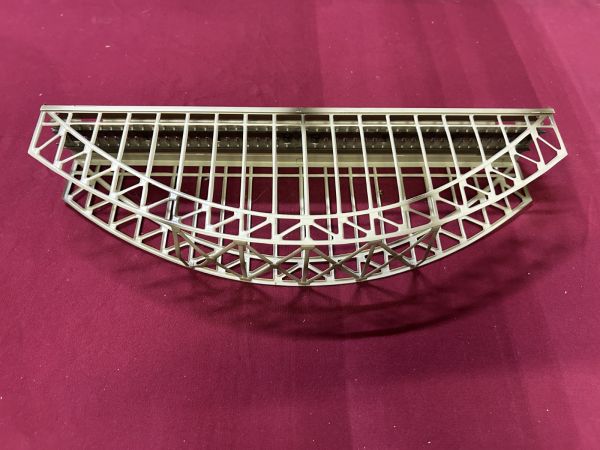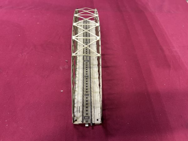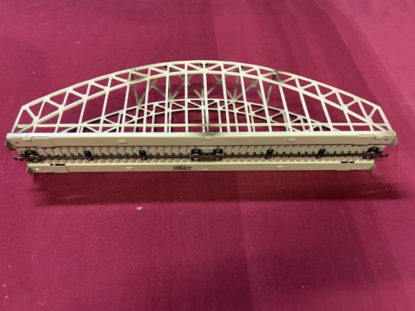 Bogenbrücke grau, festmontiertes Gleis mit Punktkontakten. Schlitze für 2 Oberleitungsmasten 7011. Bogenhöhe 11,7 cm. Länge 36 cm.