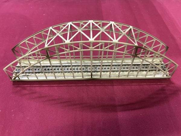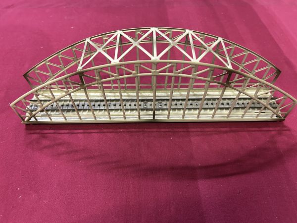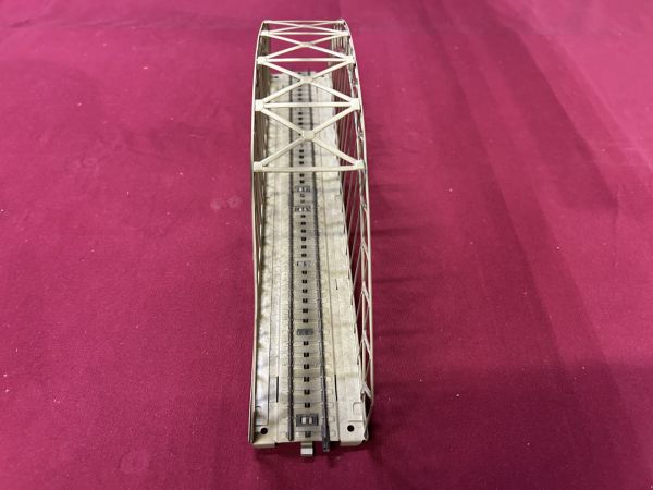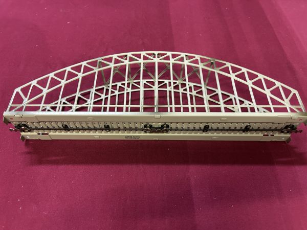 Bogenbrücke grau, festmontiertes Gleis mit Punktkontakten. Schlitze für 2 Oberleitungsmasten 7011. Bogenhöhe 11,7 cm. Länge 36 cm.