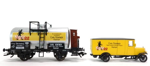 Kesselwagen mit Bremserhaus, Kunststoff-Gehäuse, Aufschrift Nigrin CARL GENTNER, Nr.502186 . Mercedes-LKW gelb, Metall-Gehäuse, ebenfalls mit den Aufschriften.