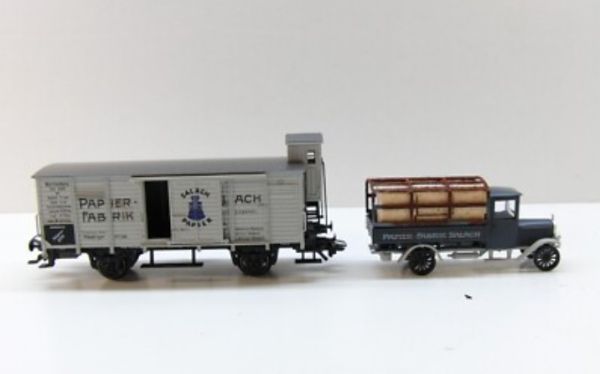 Gedeckter Güterwagen mit Bremserhaus, Schiebetüren zum Öffnen, Aufschiften: Museum 1996, Papier-Frabrik Salach, Oldtimer-LKW mit Ladegut.