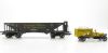 Trichterwagen, Aufschrift Leonhard Weiss, grau, mit Oldtimer Kipp-LKW, gelb.