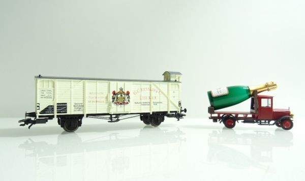 Gedeckter Güterwagen mit Bremserhaus, Kunststoff-Gehäuse, Aufschrift Kessler Sektkellerei. Oldtimer-LKW mit Sektflasche beladen.
