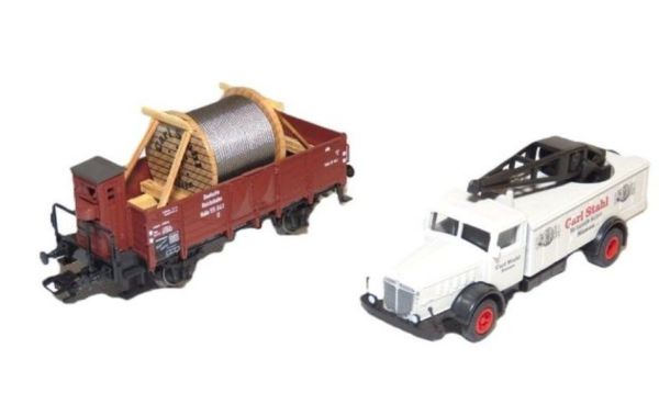 Offener Güterwagen mit Bremserhaus, beladen mit Drahtseilrolle aus Holz. Oldtimer-LKW mit Kranaufsatz. Aufschrift Seilerei Carl Stahl.