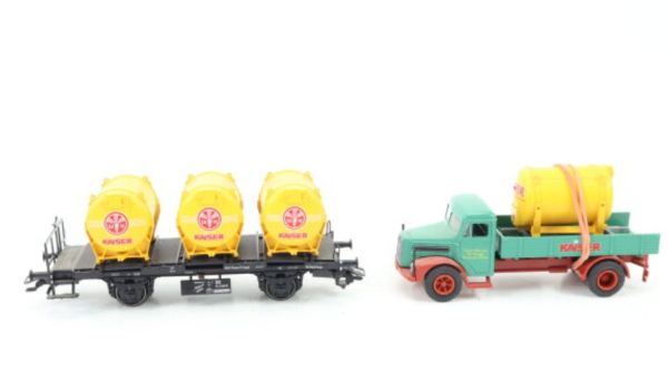 Behältertragwagen mit 3 Behältern der Brauerei Kaiser. Aufschrift KAISER. Offender Oldtimer-LKW beladen mit einem Behälter.