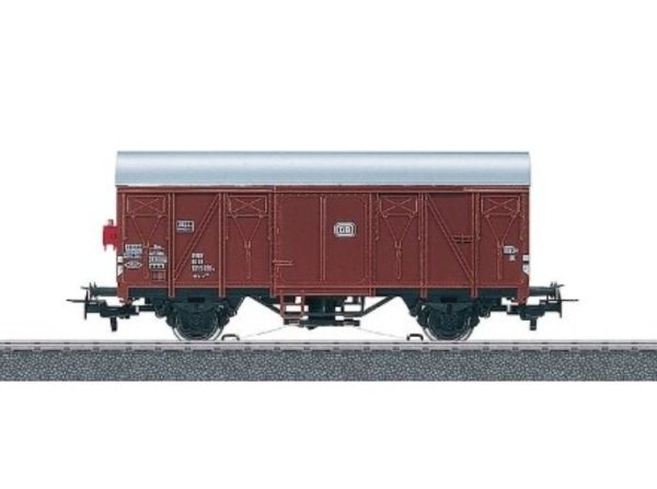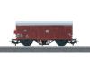 Gedeckter Güterwagen mit Flachdach und hochstehenden Bremserhaus. Aufschrift erhaben 312.
