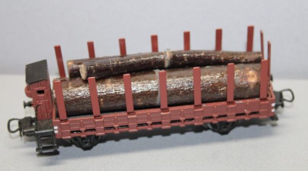 Rungenwagen mit Bremserhaus. Guss-Gehäuse. Metall-Rungeneinsatz. Beladen mit Stammholz.