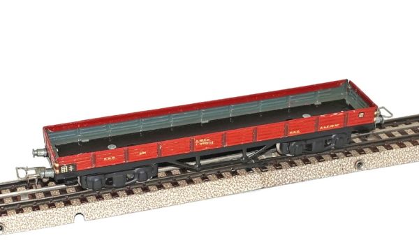Niederbordwagen 4-achsig, Blech-Gehäuse, Aufschrift D.R.B. 391 MÄRKLIN
