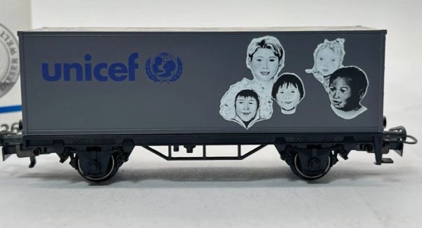 Containerwagen, Kunststoff-Gehäuse, Aufschrift unicef, Bilder von Spielzeug auf dem Dach und Kinder auf den Seiten.