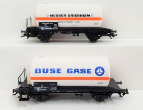 Inhalt: 2 Stück 2-achsige Gas-Kesselwagen mit Aufschrift Messer Griesheim und BUSE GASE. Kunststoff-Gehäuse.