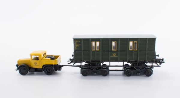 Fahrt ins Postmuseum. Inhalt: 1 Bahnpostwagen mit Post-LKW aus Metall und Kälble.