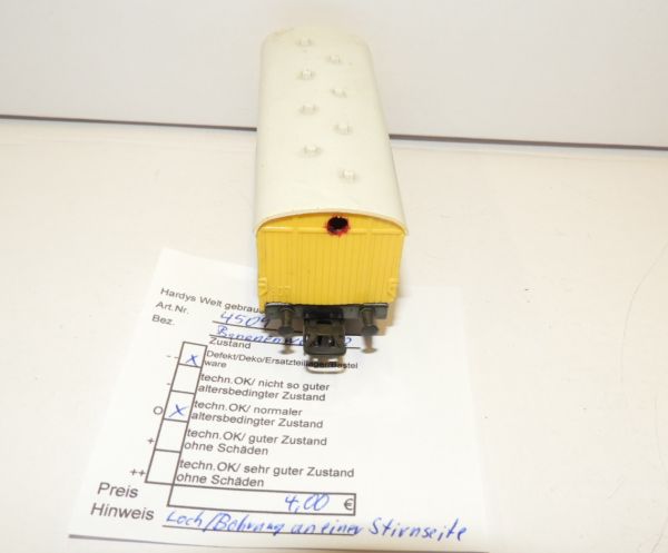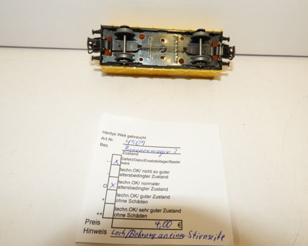 Hinweis: Nicht ganz sicher ob es Bananenwagen ist (keinerlei Beschriftung mehr zu erkennen). Loch an einer Stirnseite.