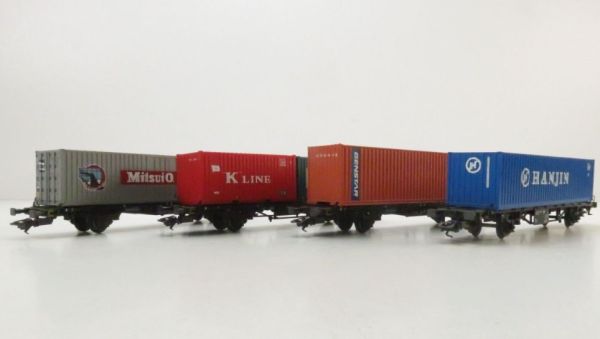 Inhalt: 4 Containertragwagen beladen mit verschiedenen Containern. Aufschrift NANJIN, MitsuiO.S.K.Lines, L Line, GENSTAR