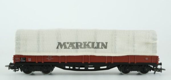 Kunststoff-Aufbau, zwei Drehgestelle, weisse Stoffplane mit Aufschrift MÄRKLIN, Wagenaufschrift Betriebsnr. 496 391