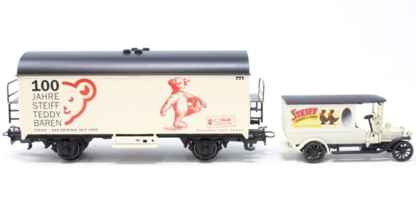 Gedeckter Güterwagen, Kunststoff-Gehäuse, Aufschrift 100 Jahre Steiff Teddy Bären. Oldtimer-LKW