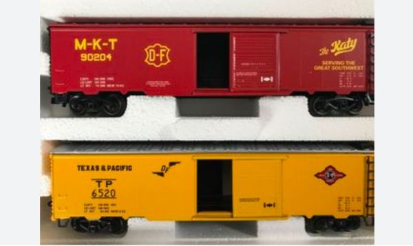 Inhalt: 2 Box Cars 50 Fuss, Blech-Gehäuse, Aufschrift M-K-T 90204 The Katy, TP 6520