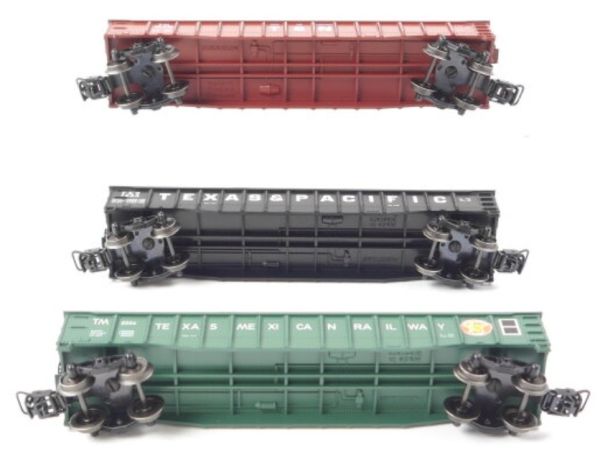 Inhalt: 1 Gondola braun Aufschrift T&N 313, 1 Gondola schwarz mit Metall-Bodenplatte Aufschrift TEXAS & PACIFIC, T&P 7234, 1 Gondola grün mit Metall-Bodenplatte Aufschrift Nr. TM 2034