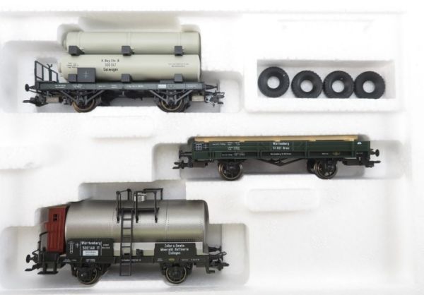 Inhalt: Gaswagen mit 3 Gasbehälter, Kesselwagen mit Bremserhaus, Niederbordwagen beladen mit 4 Reifen.
