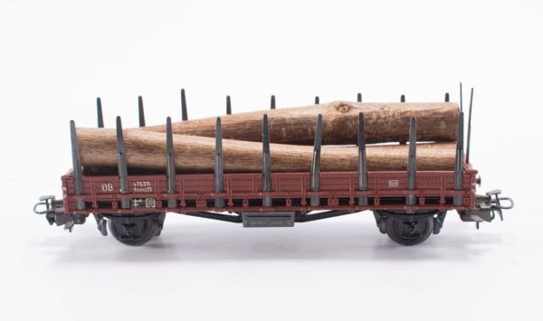 Rmms 33 Rungenwagen der DB, Kunststoff-Gehäuse, 22 abnehmbare Blech-Rungen mit aufschiebbaren Rungenfach, beladen mit Holzstämmen