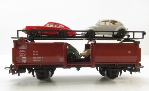 Off 52 der DB, Guss-Gehäuse, beladen mit 4 PKW