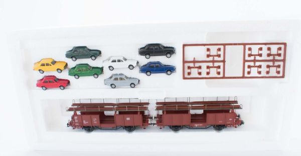 Autotransportwagen als Doppeleinheit Bauart Laae 52 der Deutschen Bundesbahn (DB). Zweistöckige Ausführung. Oberdeck absenkbar. Beladen mit 8 Modellen des Ford Escort um 1970. Passende Haltekeile liegen bei.