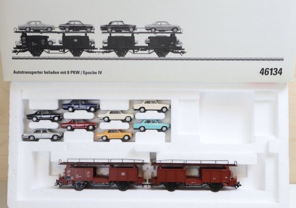 Doppeleinheit Bauart Laaes 541 der Deutschen Bundesbahn (DB). Zweistöckige Bauart für Personenkraftwagen. Neuwagen-Transport der Mercedes-Benz Typen W114/W115 und C114.