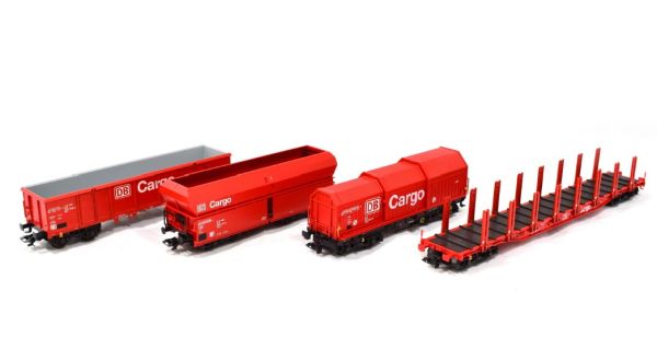 Inhalt: Sattelwagen Fals, offener Güterwagen Eaos, Teleskophaubenwagen mit 3 Stahlrollen als Ladung, 4achsiger Rungenwagen Snps. Aufschrift Cargo