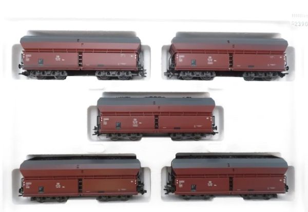 Inhalt: 5 Sattelwagen Fad 50, Kunststoff-Gehäuse, Aufschrift Nr. 614 558, 613 540, 613 782, 613 284, 614 669, beladen mit echtes Koks