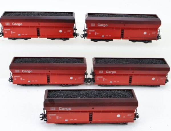 Inhalt: 5 Sattelwagen Fals 175, Kunststoff-Gehäuse, Aufschrift Cargo, Nr. 665 1 901-4, 665 1 803-2, 665 2 035-0, 665 1 933-7, 665 1 995-6, beladen mit echter Kohle
