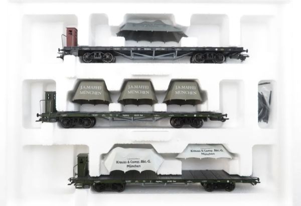 3 verschiedene Flachwagen SSml der Königlich Bayerischen Staatsbahn (K.Bay.Sts.B.). Ausführung mit Bremserhaus. Jeweils unterschiedliche Betriebsnummern. Rungen und Planen abnehmbar.