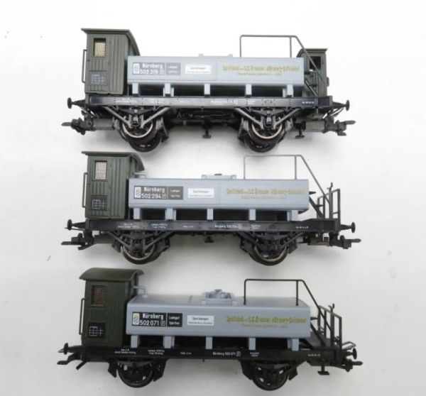 Spiritus-Privatwagen, eingestellt bei der Königlich Bayerischen Staatsbahn (K.Bay.Sts.B.). 3 Wagen in unterschiedlichen Ausführungen und mit verschiedenen Betriebsnummern. Filigrane Ausführung mit durchbrochenem Wagenboden. Nachbildung des Pumpenhauses. Separat angesetzter Kesselaufstieg mit Handlauf.
