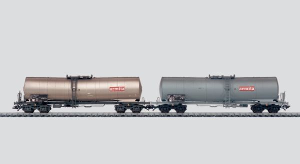 Inhalt: 2 Mineralölwagen mit Knickkessel, eingestellt bei den Niederländischen Eisenbahnen (NS) und den Belgischen Staatsbahnen (SNCB/NMBS). Privatwagen der Firma Armita.