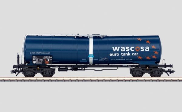 Universalwagen für brennbare Flüssigkeiten, eingestellt bei der Deutschen Bahn AG (DB AG). Privatwagen der Schweizer Transportfirma Wascosa, Zug. Gestaltung als euro tank car. Kunststoff-Gehäuse, Aufschrift Wascosa