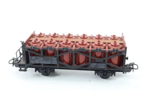 Behälterwagen beladen mit Säurebehälter, Kunststoff-Gehäuse, Aufschrift VTG mit Logo, Wagennr. 090 0 104-9