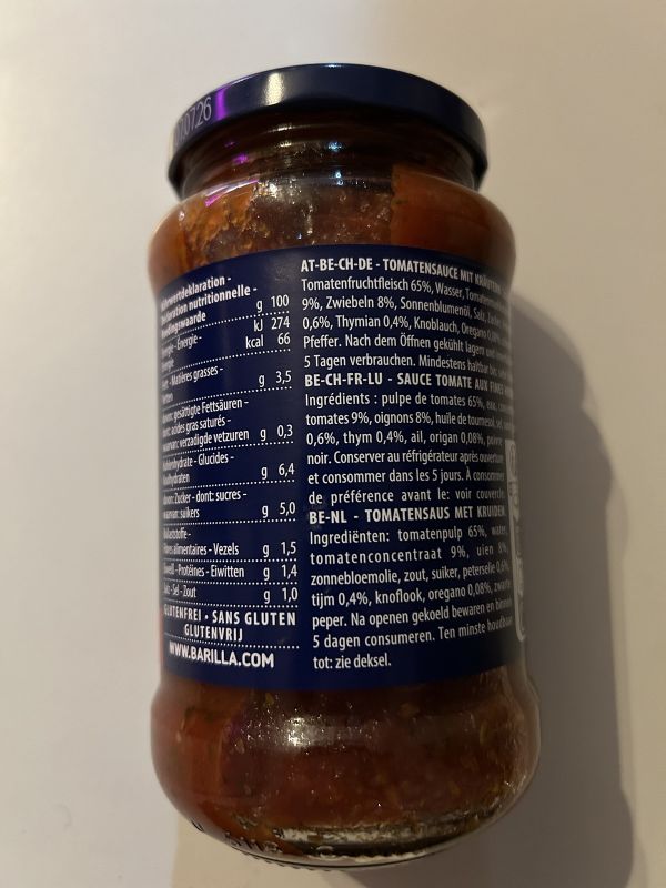 TOMATENSAUCE MIT KRΕTERN. Zutaten: Tomatenfruchtfleisch 65%, Wasser, Tomatenmarkkonzentrat 9%, Zwiebeln 8%, Sonnenblumenöl, Salz, Zucker, Petersilie 0,6%, Thymian 0,4%, Knoblauch, Oregano 0,08%, schwarzer Pfeffer.