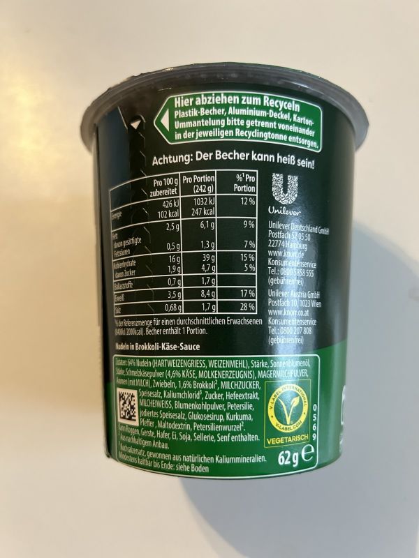 Zutaten: 64% Nudeln (HARTWEIZENGRIESS, WEIZENMEHL), Stärke, Sonnenblumenöl, Stärke, Schmelzkäsepulver (4,6% KÄSE, MOLKENERZEUGNIS), MAGERMILCHPULVER, Aromen (mit MILCH), Zwiebeln, 1,6% Brokkoli², MILCHZUCKER, Speisesalz, Kaliumchlorid³, Zucker, Hefeextrakt, MILCHEIWEISS, Blumenkohlpulver, Petersilie, jodiertes Speisesalz, Glukosesirup, Kurkuma, Pfeffer , Maltodextrin, Petersilienwurzel². Kann Roggen, Gerste, Hafer, Ei, Soja, Sellerie, Senf enthalten. ² Aus nachhaltigem Anbau. ³ Kochsalzersatz, gewonnen aus natürlichen Kaliummineralien.