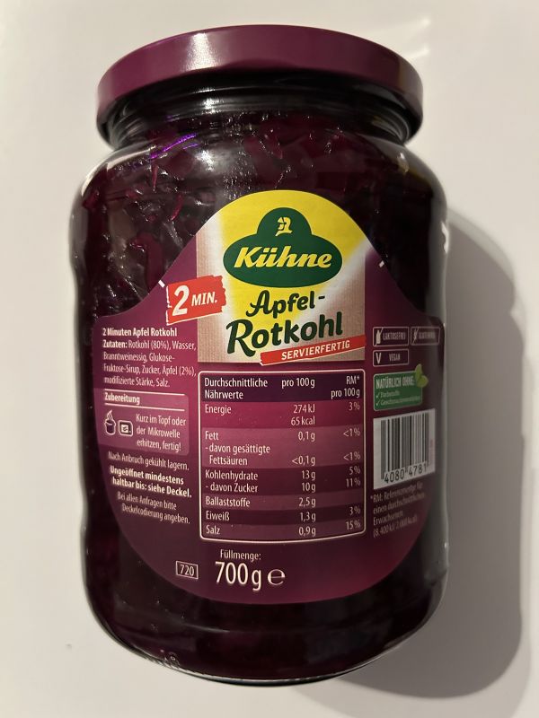 Rotkohl (80 %), Wasser, Branntweinessig, Glukose-Fruktose-Sirup, Zucker, Äpfel 2%, modifizierte Stärke, Salz