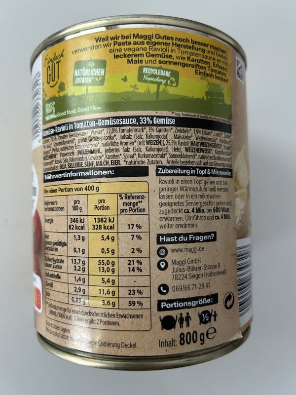 Zutaten: 74,5% Tomaten-Gemüsesauce [Wasser*, 22,8% Tomatenmark*, 3% Karotten*, Zwiebeln*, Lauch*, Zucker*, 1,4% Erbsen*, Sonnenblumenöl*, 1% Mais*, Jodsalz (Salz, Kaliumjodat), grüne Gemüsepaprika*, Maisstärke*, Weinessig*, Knoblauch*, Oregano*, Pfeffer*, natürliches Estragonaroma*, natürliche Aromen* (mit WEIZEN)], 25,5% Ravioli [HARTWEIZENGRIESS*, Wasser*, WEIZENMEHL*, Paniermehl (WEIZENMEHL, Jodsalz (Salz, Kaliumjodat), Hefe), WEIZENEIWEISS*, Kartoffelstärke*, Erbsenmehl*, Jodsalz (Salz, Kaliumjodat), Gewürze*, Karotten*, Spinat*, Kurkumaextrakt*, Sonnenblumenöl*, natürliches Basilikumaroma*]. Kann SELLERIE, EIER, MILCH, SENF und SOJA enthalten. *natürliche Zutaten.