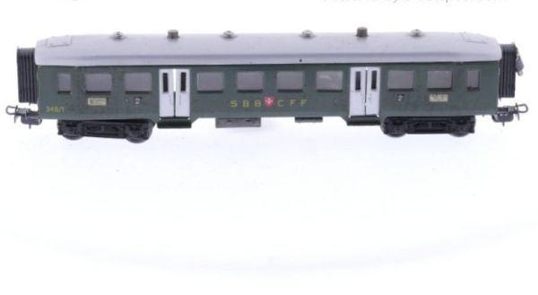 2.Klasse Wagen der SBB, Blech-Gehäuse, Türenöffnung über Dach-Drehknöpfe, Aufschrift SBB CFF 348/1