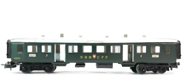 2.Klasse Wagen der SBB, Blech-Gehäuse, Türenöffnung über Dach-Drehknöpfe, Aufschrift SBB CFF, schweizer Wappen