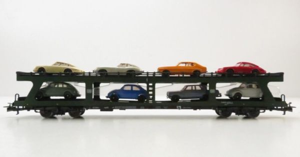 DDM 915 der DB, Kunststoff-Gehäuse, Aufschrift Nr. 51 80 98-40 001-4, beladen mit 8 verschiedenen Wiking-Autos