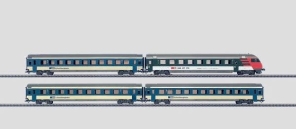 Inhalt: 4 Wagen der Lötschbergbahn, WENDEZUG der BLS. Kunststoff-Gehäuse.Großraumwagen A, 1.Klasse Nr.10-75 406-0, Großraumwagen B, 2.Klasse Nr.21-75 420-8, Großraumwagen B, 2.Klasse Nr.21-75 419-0, Steuerwagen Bt der SBB, Bauart Euro-City, 2.Klasse mit Führerstand Nr. 28-94 957-9