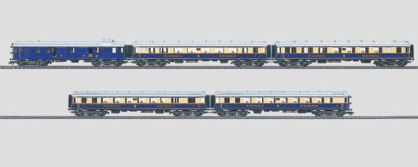 Inhalt: 5 Fern-Schnellzugwagen Aufschrift DEUTSCHE REICHSBAHN, Blech-Gehäuse mit Kunststoffdächer. 1 Salonwagen 2.Klasse, 1 Salonwagenwagen 2.Klasse mit Küche, 1 Salonwagen 1.Klasse, 1 Salonwagen 1.Klasse mit Küche, 1 Gepäckwagen mit Schlussleuchten.