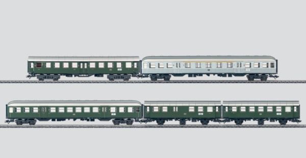 Inhalt: 5 verschiedene Personenwagen der DB um 1968, Kunsstoff-Gehäuse, Inneneinrichtungen. 1 Nahverkehrswagen, grün, 2.Klasse. 1 Nahverkehrswagen, Silberling, 1.u.2.Klasse. 1 4-achsiger Umbauwagen, grün, 2.Klasse. 1 3-achsiger Umbauwagen, grün, 2.Klasse. 1 3-achsiger Umbauwagen mit Gepächabteil.
