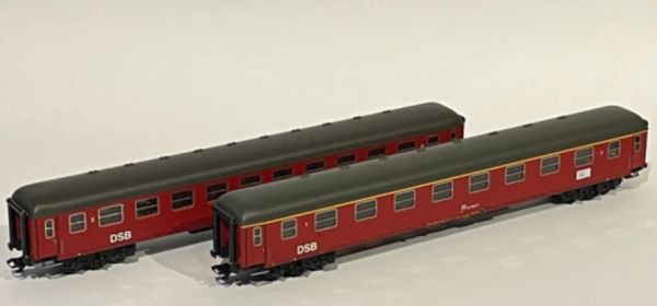 Inhalt: 1 Personenwagen litra A, 1. Klasse und 1 Personenwagen litra B, 2. Klasse der Dänischen Staatsbahnen (DSB). Rote Grundfarbgebung.