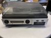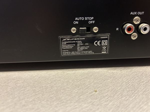 Tischgerät ohne Drucktasten, bis 35 cm Breite (Kleingerät, meist dekorativ. Nur für Netzbetrieb, doch Transportgriff möglich).Abmessungen (BHT)320 x 122 x 270 mm BemerkungStereoempfänger, auf jeder Seite befindet sich ein ovaler Lautsprecher, Plattenspielerlaufwerk 33, 45 und 78 Upm. Überspielausgang cinch.