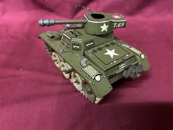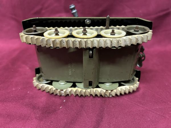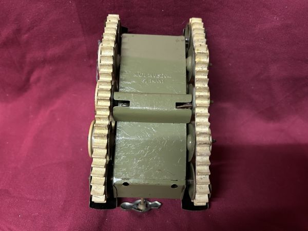 9,5 x 16, cm, Made in U.S.Zone Germany, Schlüssel (fehlt - evtl. taucht der noch auf) , Uhrwerk (nicht getestet), die Gummiketten sind ganz gut, einige Fehlteile (z.B. Schaufeln), defekte (Maschinengewehr nur eins lose noch vorhanden), eine fehlende Blechschraube wurde durch einen Draht ersetzt (passende Blechschraube dürfte kein Problem sein).