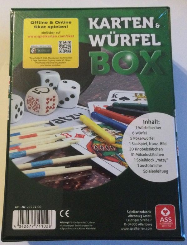 Inhalt: 1 Würfelbecher, 6 Würfel, 5 Pokerwürfel, 1 Skatspiel (franz. Bild), 20 Knobelstäbchen, 31 Mikadostäbchen, 1 Spielblock "Yatzy", 1 ausführliche Spielanleitung